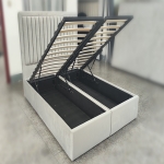 This model includes a split gas-lift mechanism, allowing both sides of the bed to open independently—ideal for organizing personal items or shared storage. The slatted platform ensures comfort and mattress breathability, with no box spring needed.