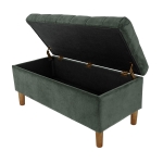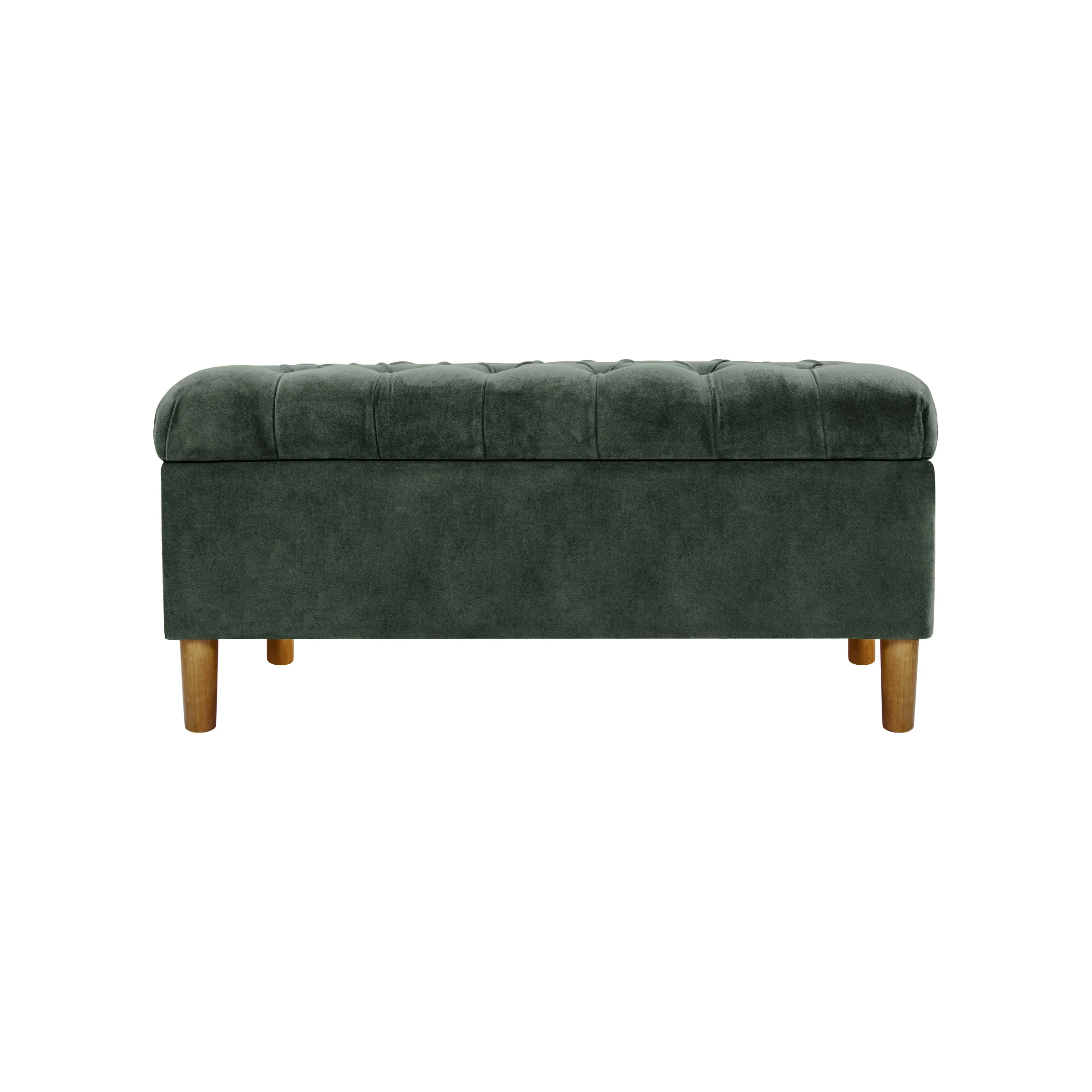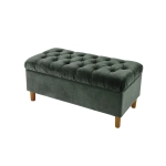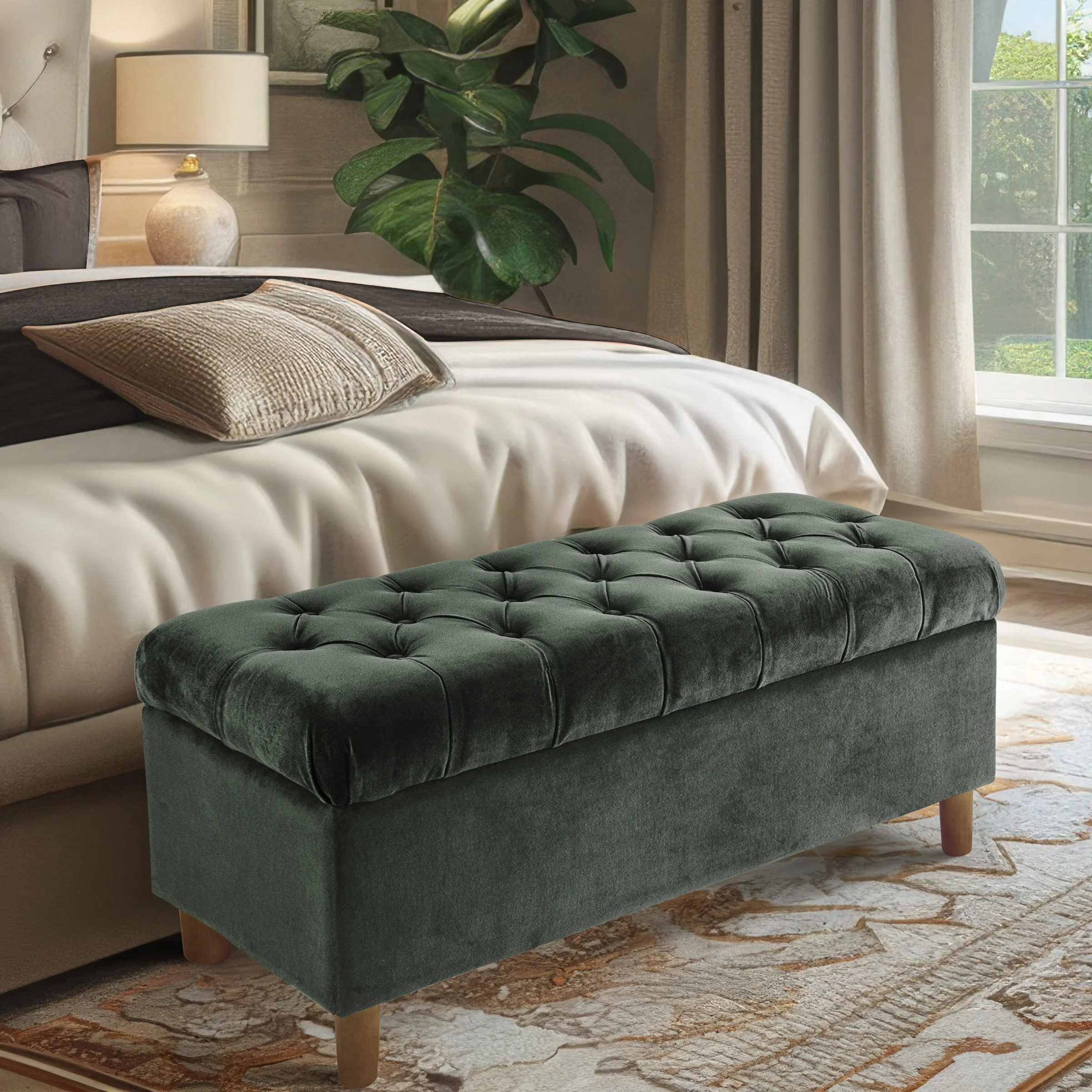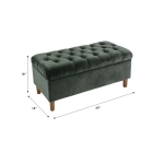This velvet storage ottoman features a hidden compartment, soft foam cushion, and solid wood legs for lasting support. Upholstered in elegant olive green fabric, it offers both style and function for entryways, bedrooms, or living rooms.