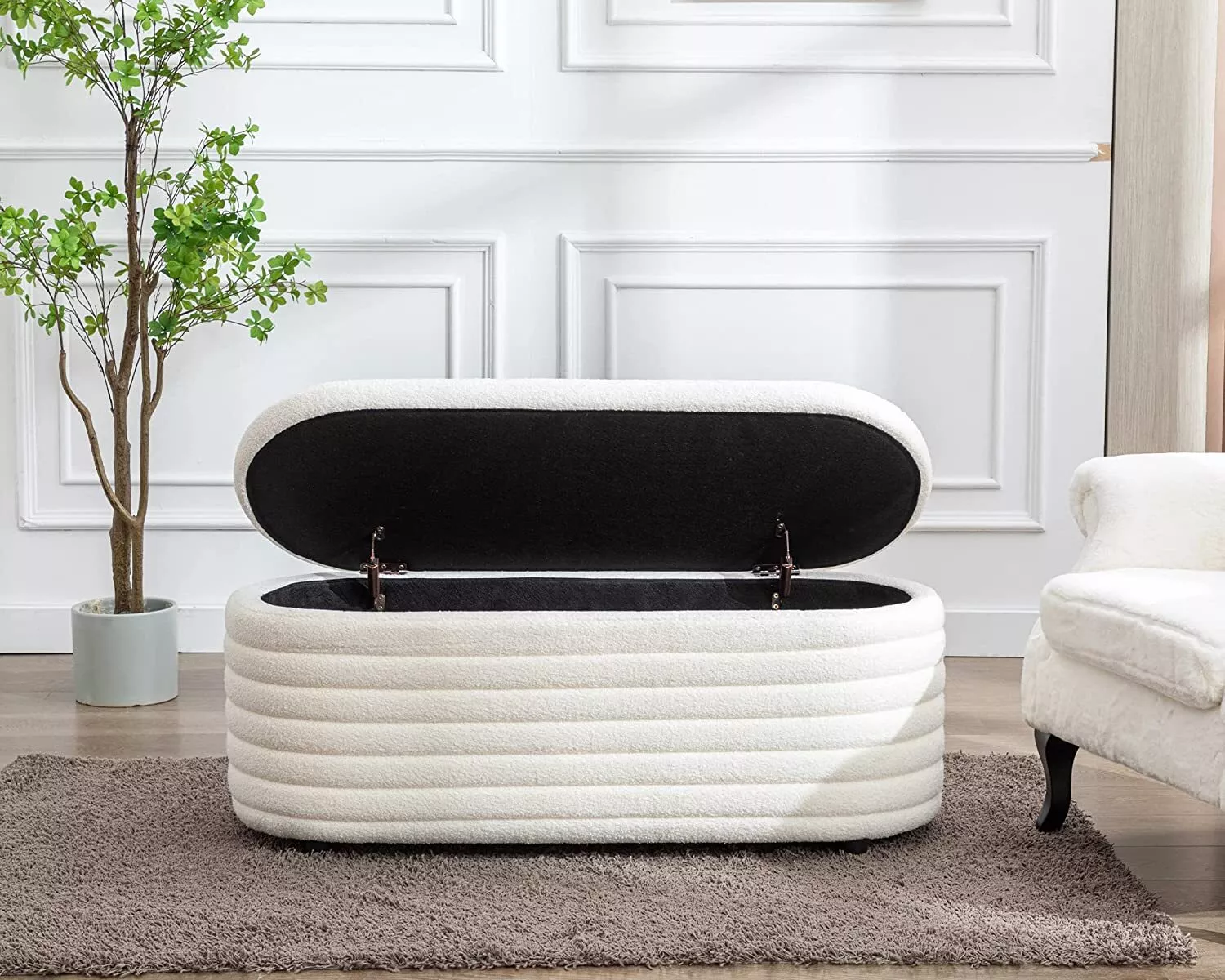 This round bouclé storage ottoman blends modern style with practical function. Its lift-up lid reveals a hidden compartment, perfect for storing remotes, cosmetics, or small accessories.