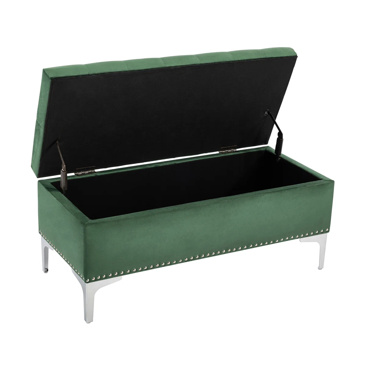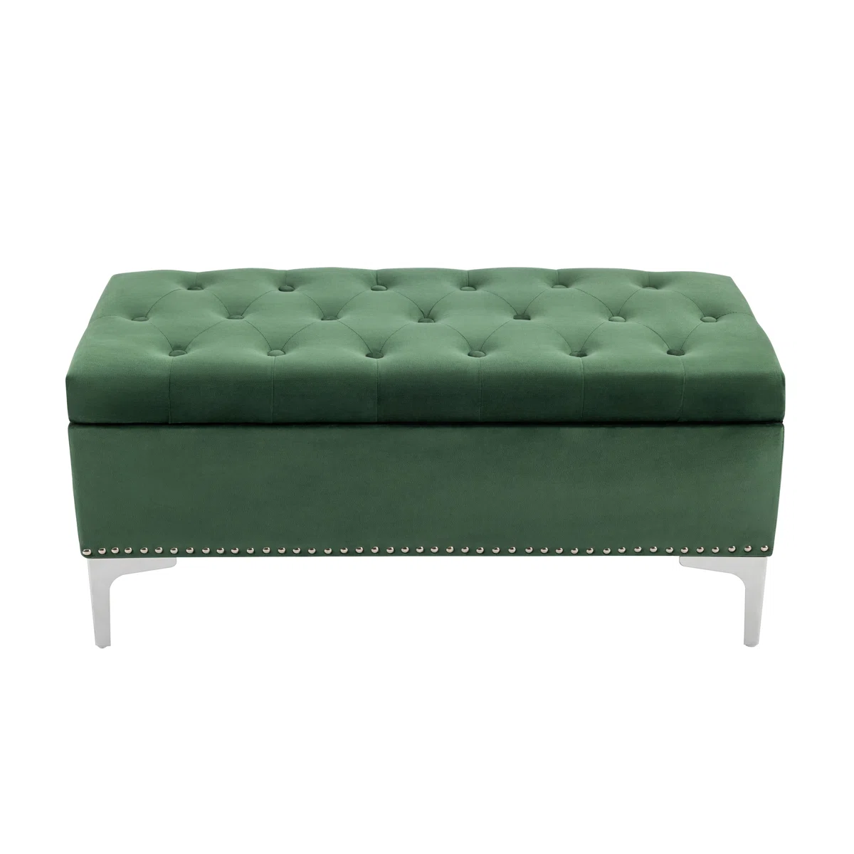 This tufted velvet storage ottoman blends sophistication and function with its deep-button seat, silver nailhead trim, and sleek metal legs. The lift-up seat reveals hidden storage—perfect for blankets, shoes, or everyday clutter.
