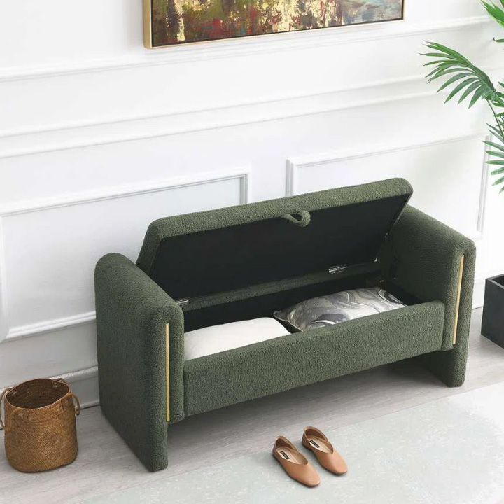 Modern Green Upholstered Storage Bench with Gold Metal Legs