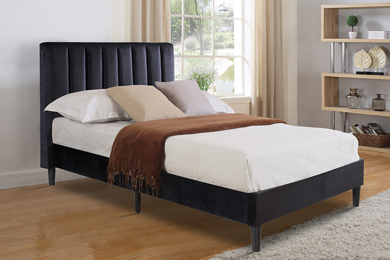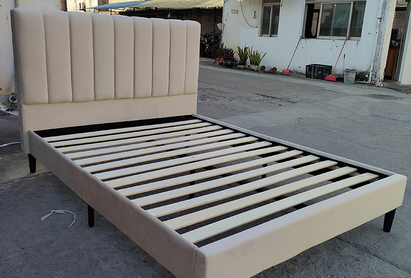 Beige Velvet Upholstered Platform Bed Frame with Vertical Channel Tufted Headboard – Modern Design
