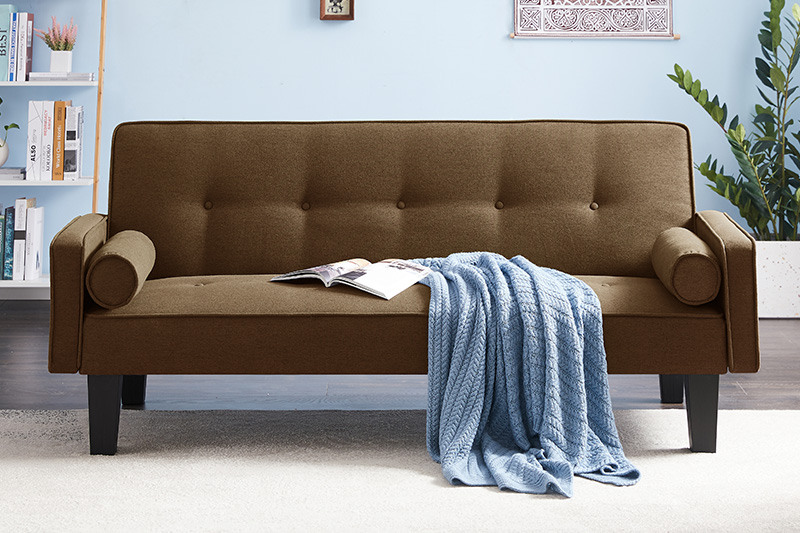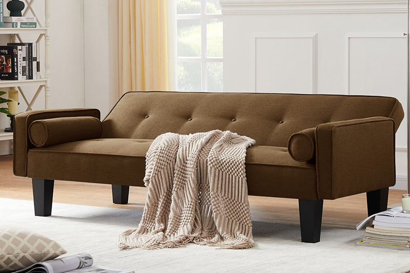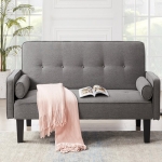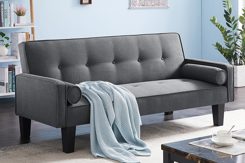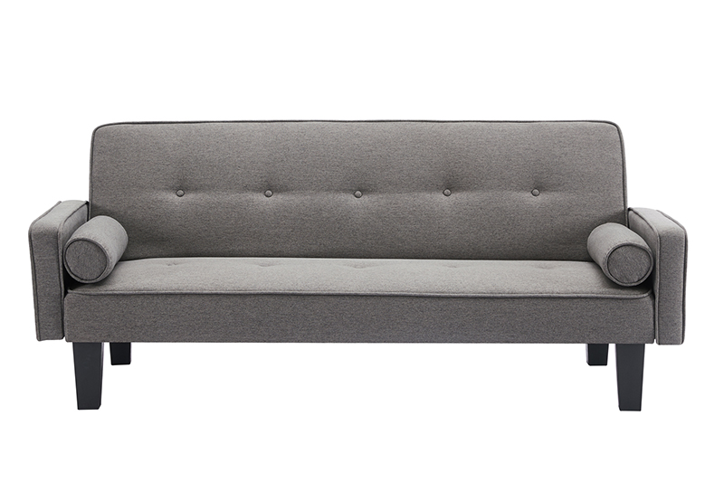 This compact grey fabric sofa bed blends modern simplicity with practical comfort. Designed with round bolster pillows, tufted backrest, and piping edge trim, it’s a stylish and space-saving solution for contemporary interiors.