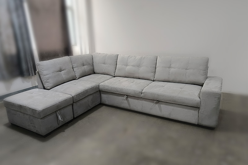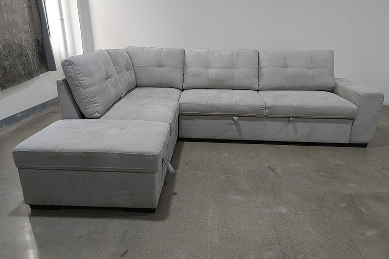 This left-facing L-shaped sectional sofa bed is a multifunctional centerpiece for any modern living space. It effortlessly transforms into a spacious bed, making it ideal for overnight guests or family lounging. Upholstered in high-quality suede fabric, the sofa features thick armrests, soft-yet-supportive pocket spring seating, and high-density foam for lasting comfort. The built-in ottoman offers convenient hidden storage, while the solid wood frame provides superior stability and durability.