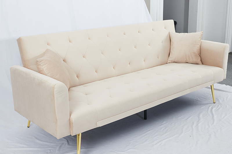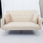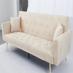 Upgrade your living space with this modern and functional 3-seater sofa bed. Upholstered in elegant beige velvet, this piece features a stylish tufted backrest and eye-catching gold metal legs that bring a contemporary flair to any room.