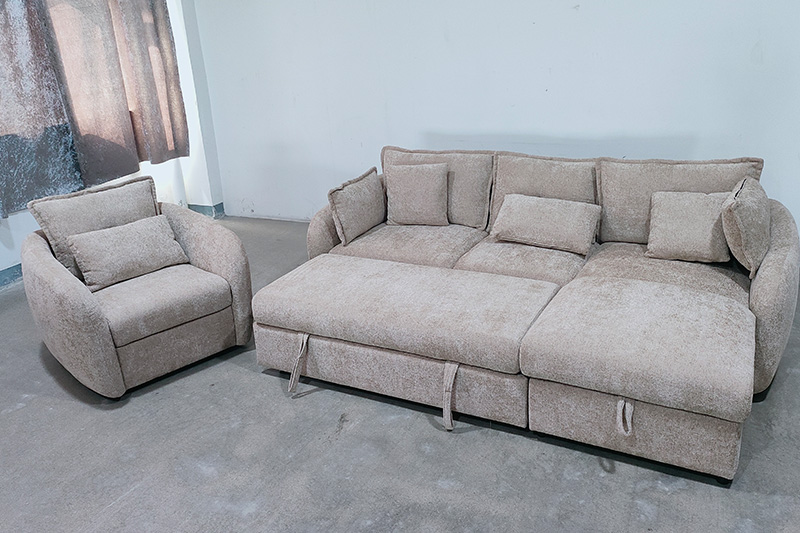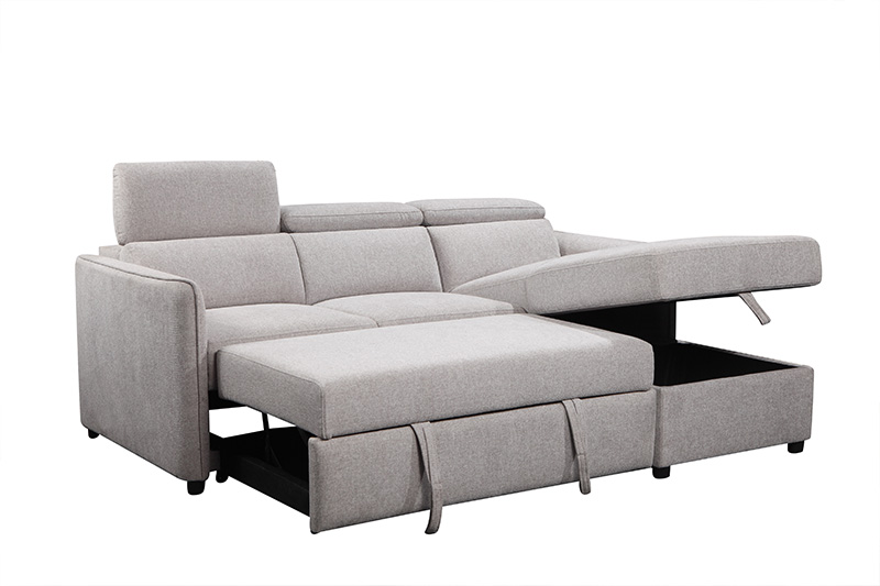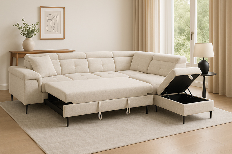 Pull-Out Sofa Bed with Adjustable Headrest & Storage Chaise – Modern Upholstered Design
