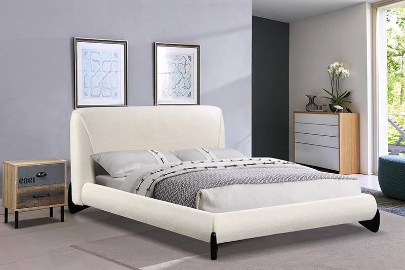 Curved Upholstered Bed Frame in Bouclé Fabric – Modern Boucle Upholstered Bed