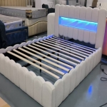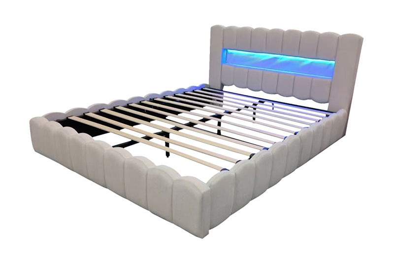This LED upholstered bed is a masterpiece from our professional upholstered furniture manufacturing team. Featuring a unique cloud-shaped curve design, the bed is upholstered with soft fabric and high-density foam, providing a full-wrap safe design for a cozy and elegant bedroom aesthetic.