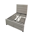 The padded, button-tufted headboard offers a refined look and a comfortable backrest. Below, four integrated storage drawers maximize bedroom space, ideal for storing linens, clothes, or accessories. The strong slatted base supports your mattress evenly while ensuring proper airflow for a better night’s sleep—no box spring required.