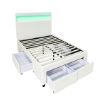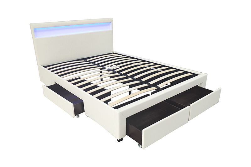The LED headboard panel provides soft, energy-efficient lighting that enhances the bedroom atmosphere. The frame includes four under-bed drawers on wheels, ideal for neatly storing bedding, clothes, or accessories. The slatted base offers excellent mattress ventilation and support without the need for a box spring.