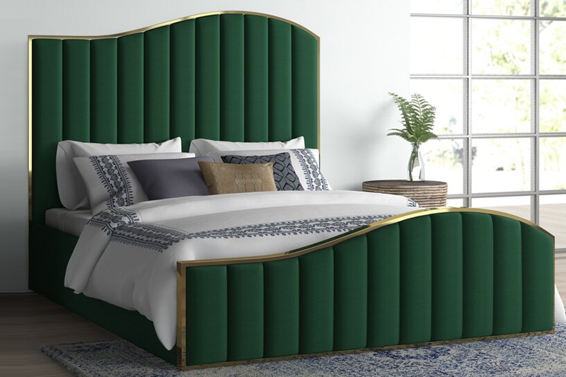 Luxury Green Velvet Upholstered Bed with Gold Trim and Sculpted Design